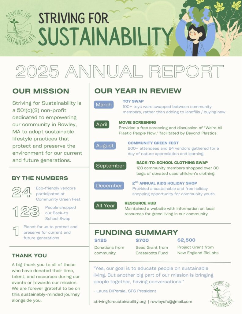 All Striving for Sustainability events and activities are supported by volunteer efforts, community donations, and local grants.