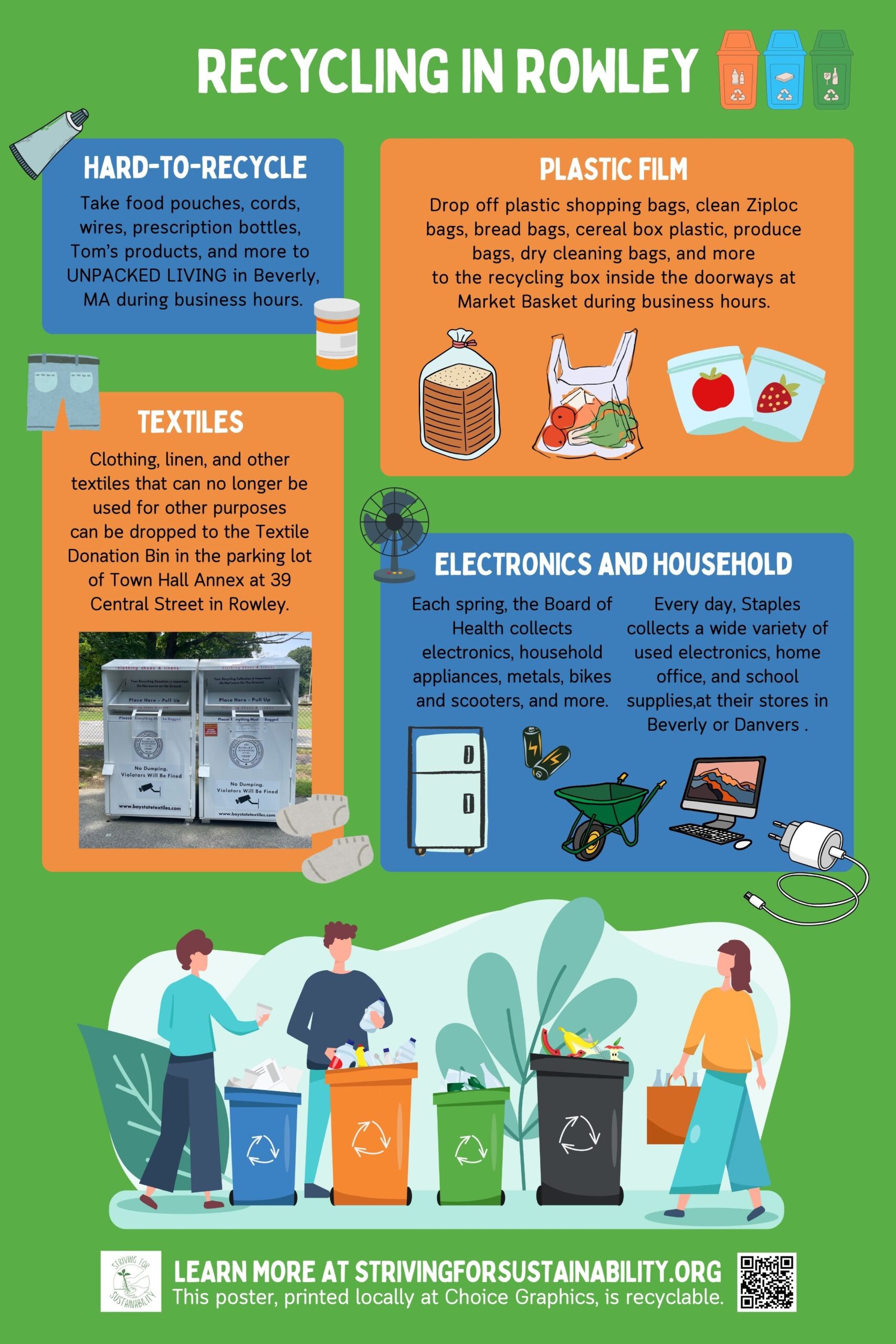 ELECTRONICS RECYCLING: The Town of Rowley Board of Health hosts a electronic recycling day each spring. Dates are posted on the Town of Rowley website, when applicable. Televisions, computer monitors, and laptops can be dropped off for a fee. All other electronics can be recycled for no fee.