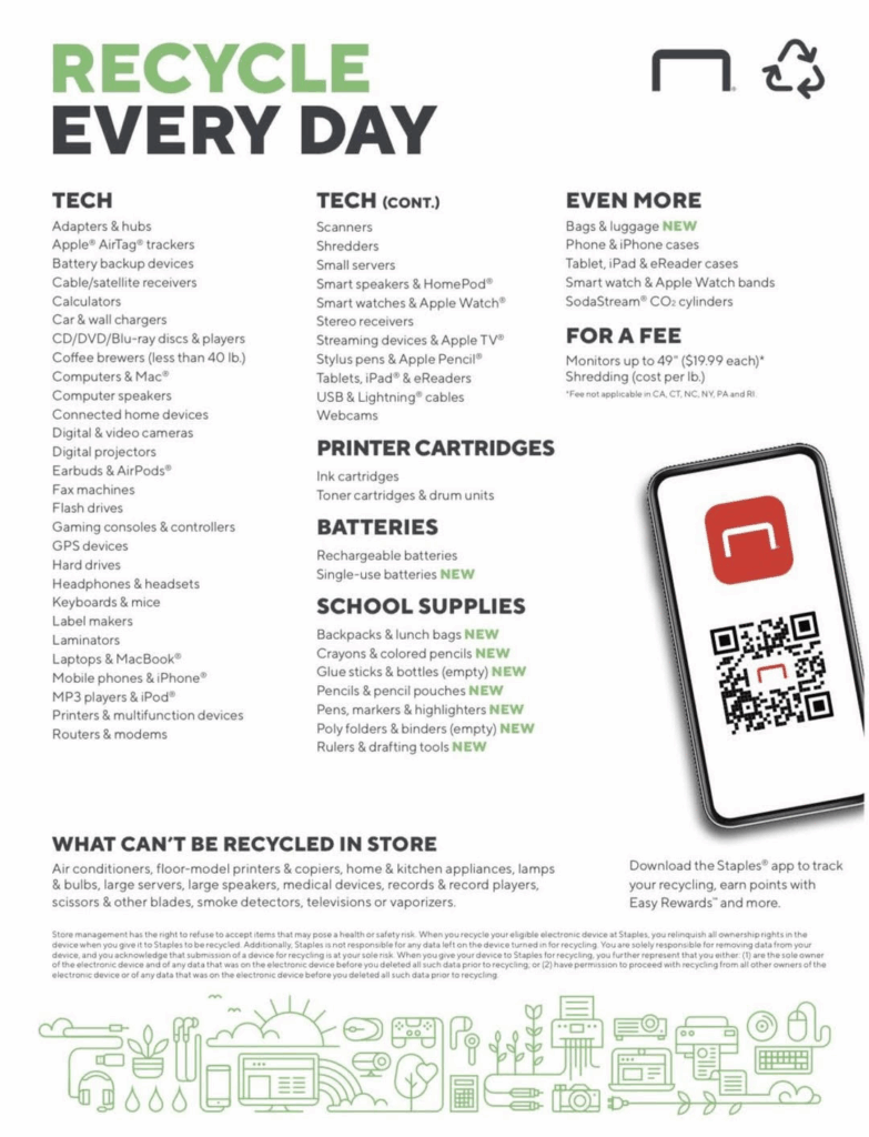 Alternatively, every day is recycling day at Staples! Swing by your local Staples (Beverly, Danvers) to electronics, batteries, ink cartridges and toner, school supplies, and more! Check out the brochure here, or see the list below.