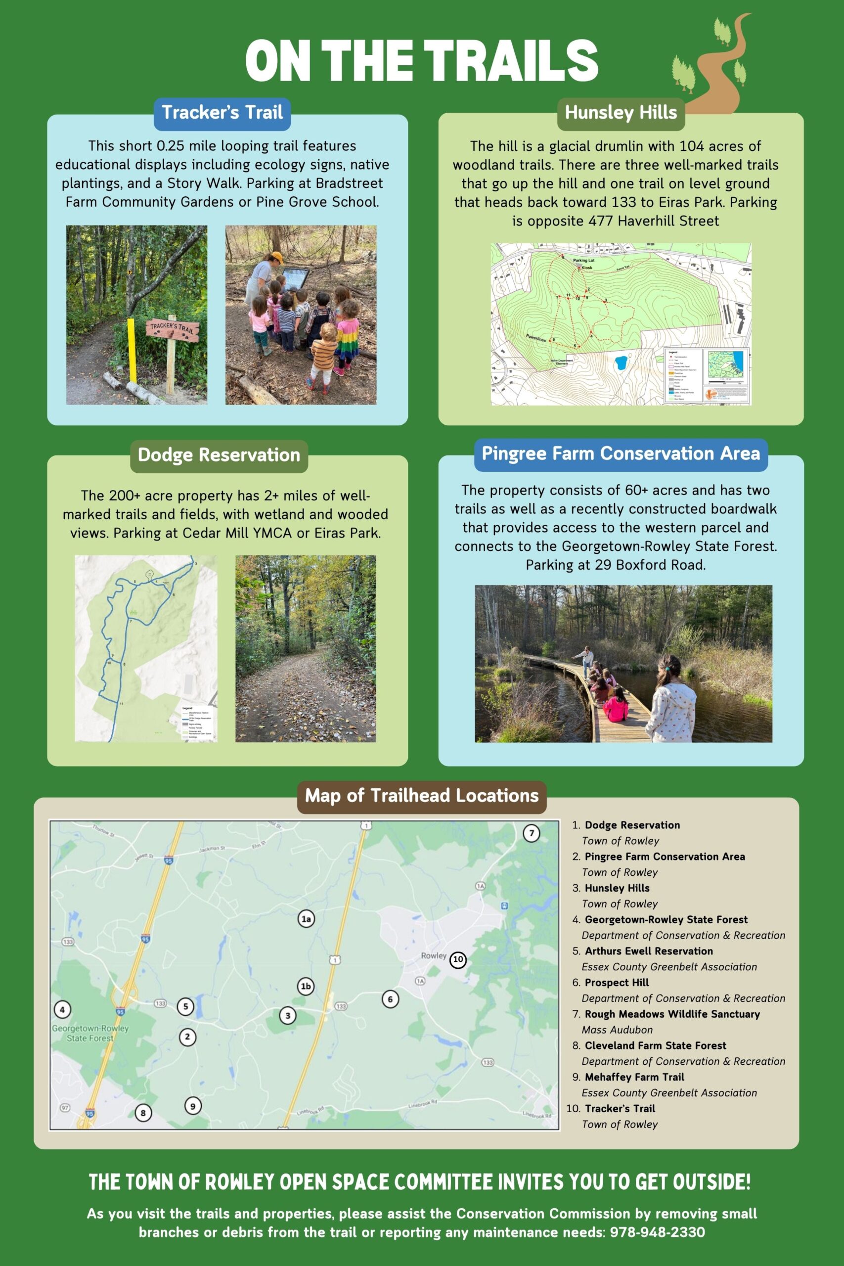 Tracker’s Trail (239 Main Street in Rowley) is a new educational nature trail located on municipal forested land behind Pine Grove School and adjacent to Bradstreet Farm. The family-friendly trail can be accessed from the Community Gardens located at 239 Main Street in Rowley (stay to the right when the driveway forks). The trail is a short 0.35 mile loop that takes visitors past interpretive ecology signs, raised beds with native flowers, and a Story Walk.
