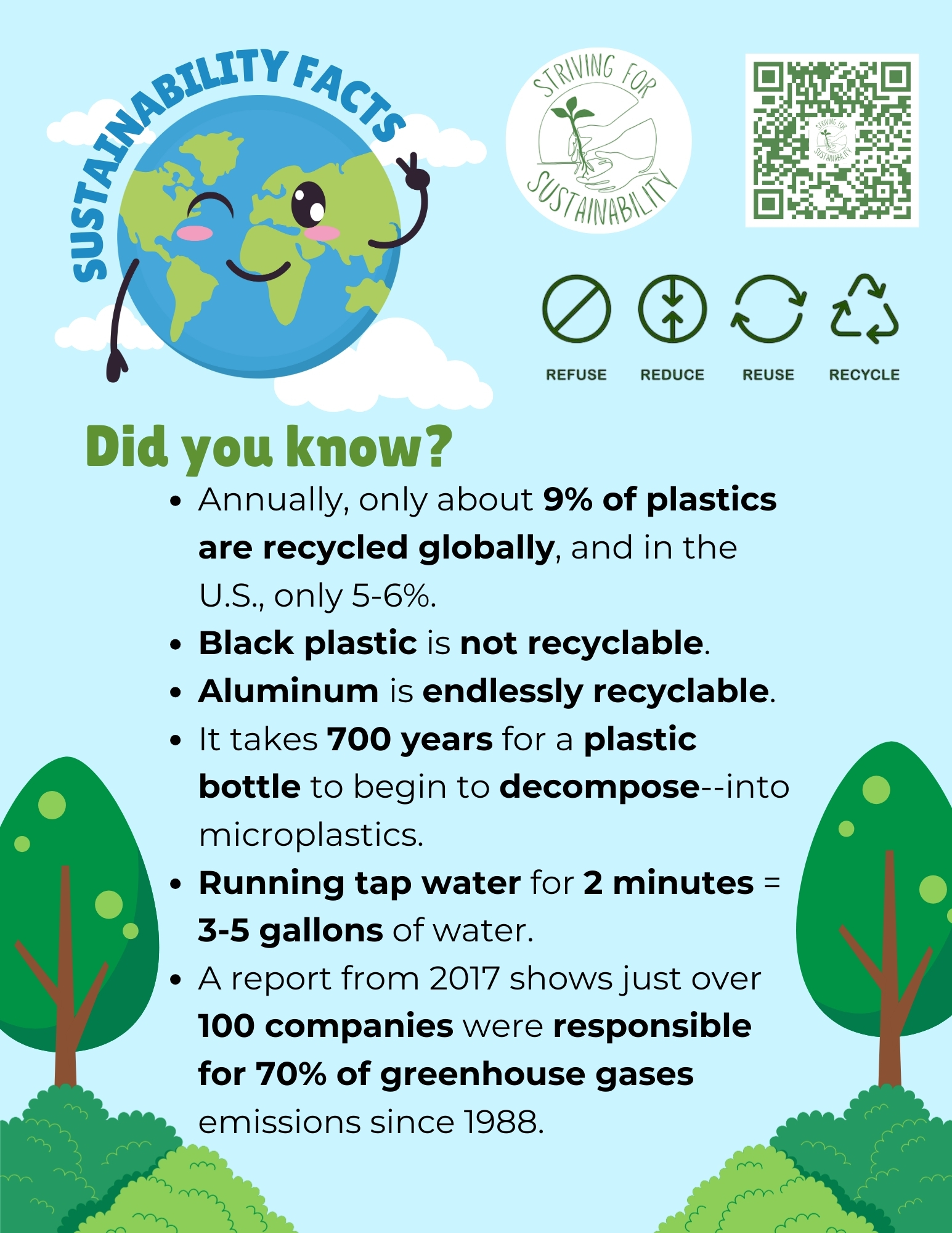 Check out our Sustainability Facts to learn why and how to refuse, reduce, reuse, and recycle!