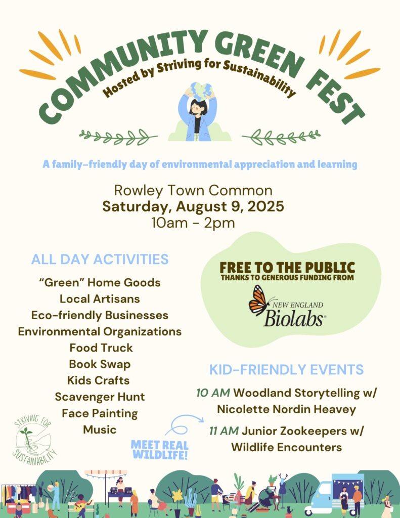 Striving for Sustainability hosted a Community Green Fest on the Rowley Town Common on August 9, 2025. Over 200 attendees, vendors, and volunteers made the day fun, educational, and inspirational. A big thank you to New England Biolabs for generously supporting the event.