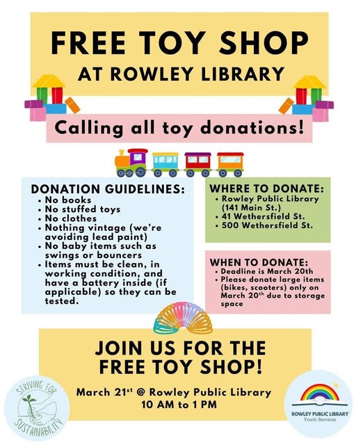 Striving for Sustainability is once again partnering with the Rowley Public Library to host a Toy Swap! This event gives families the opportunity to donate, swap, or take gently used toys. Swap items will include baby toys, toy trucks, puzzles, games, art supplies, and more!